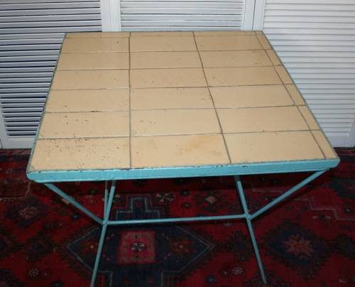 A STUNNING SQUARE VINTAGE TABLE WITH A TILED TOP AND STEEL FRAME - PATIO PERFECT!!! YOU CAN DO YOUR OWN MOSAIC TEQNIC ON THE TOP.
