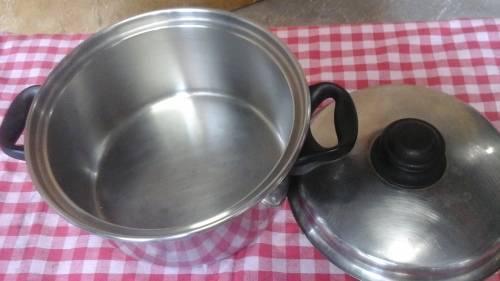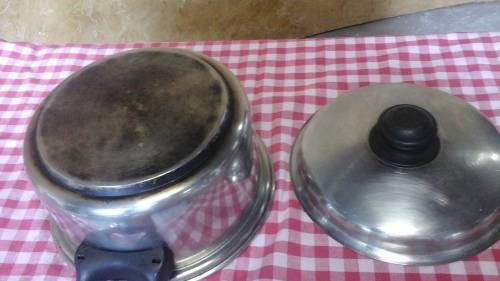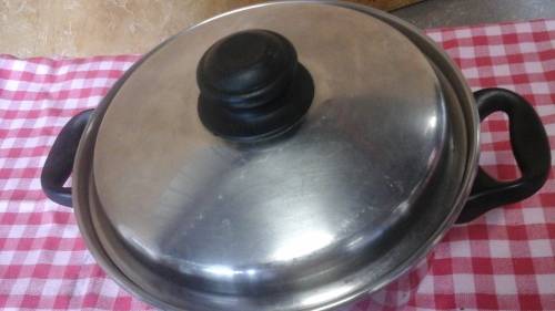 A STUNNING STAINLESS STEEL SMALL SAUCEPAN THAT HAS TWO HANDLES. EVEN THE LID IS STAINLESS