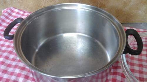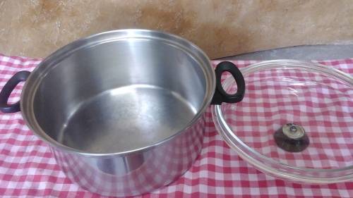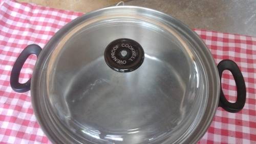 A STUNNING STAINLESS STEEL SMALL SAUCEPAN THAT HAS TWO HANDLES. THE LID IS GLASS AND STAINLESS