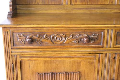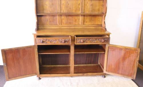 This stunning tall solid oak Welsh Dresser/ display buffet with a double-door cupboard and two good size cutlery drawers measures a very decent 137.5cm long x 47.5cm deep x 182.5cm high. The Welsh dresser has two full length display shelves on the upper section with a slot for display plates and has beautiful carved detailing on the drawers and scroll detailing on each of the cabinet doors. The Welsh dresser is in two sections for easy moving. There is minimal/ normal age and usage related wear and tear. The dresser is solidly made and sits very well on the ground. Please view the pics carefully to fully appreciate this stunning solid oak Welsh Dresser and to confirm the condition.