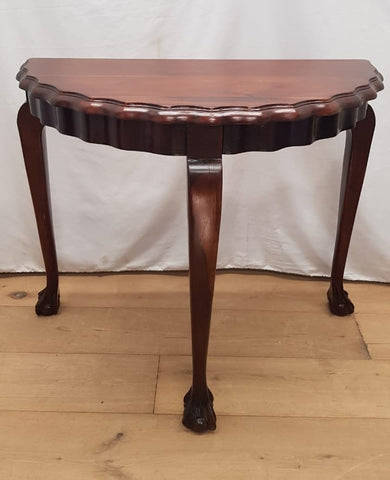 This stunning traditional vintage solid Imbuia ball & claw half moon hall table with scalloped edges is in lovely vintage condition and measures 91cm long x 44cm wide x 75cm high. The table has good weight to it and sits comfortably on the ground. This would be the ideal table for an entrance hall or broader passage way with a lamp of bouquet of flowers or a stunning piece of art.