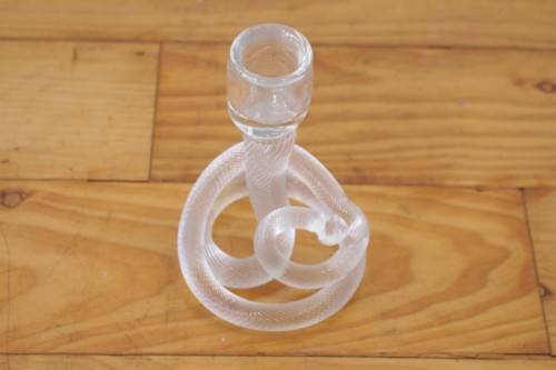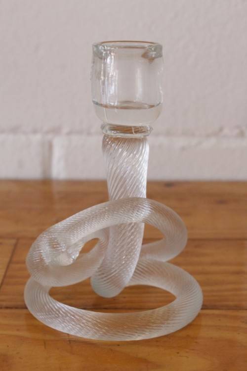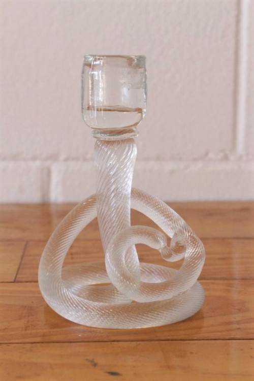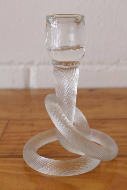This stunning and very unusual hand blown glass single-candle candle stick has the most incredible twirled glass base and measures roughly 9.5cm long x 9.5cm wide x 14cm high. The candle stand has absolutely no chips or cracks in it and it it a one of a kind pieces. The tightly twirled stem makes it almost look like a coiled snake. The candle holder would look amazing on a small round romantic dinner table and one could also twirl greenery and flowers through it. Please view the pics carefully to fully appreciate this amazing hand blown glass candle holder and to confirm the condition.