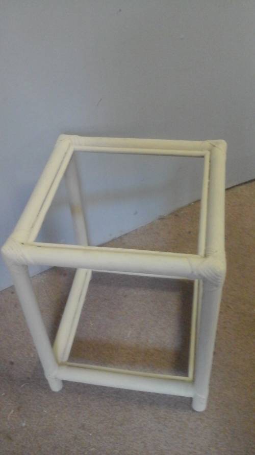 A STUNNING VINTAGE CHALK PAINTED SQUARE CANE/RATTAN COFFEE TABLE. HAS A GLASS TOP AND A GLASS SHELF