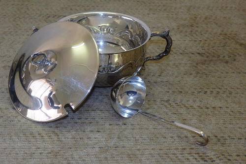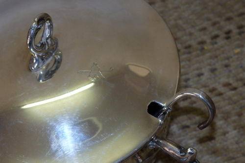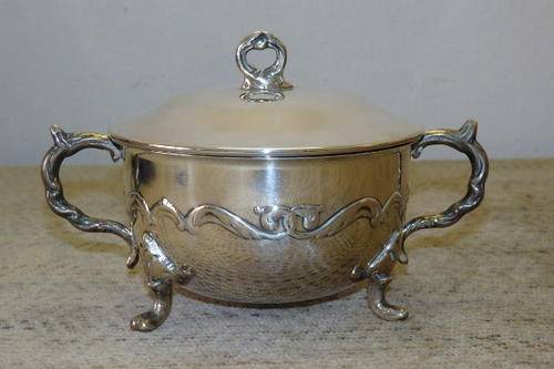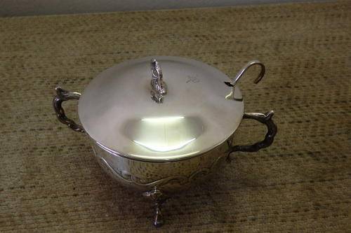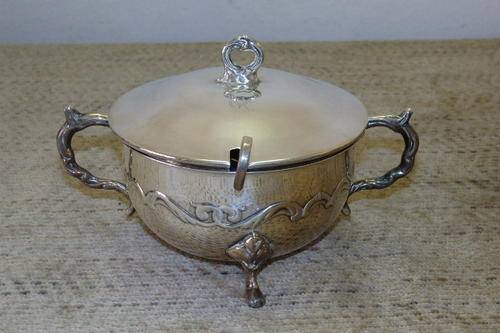 A STUNNING VINTAGE EMESS SILVER PLATED (SP ON B) LIDDED SUGAR/ JAM BOWL WITH A SILVER PLATED SPOON