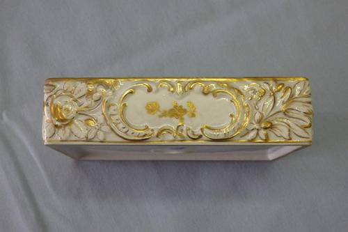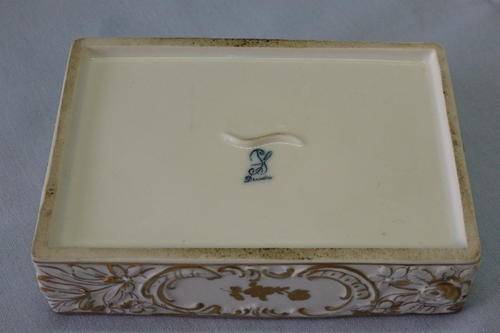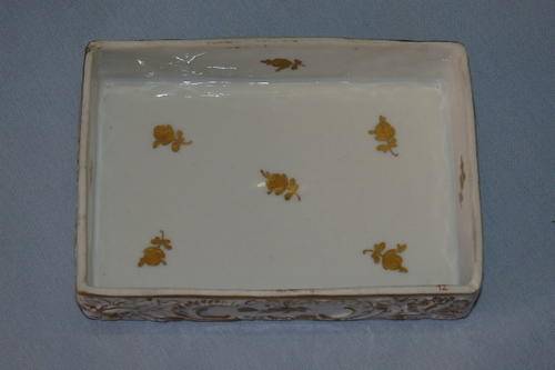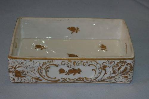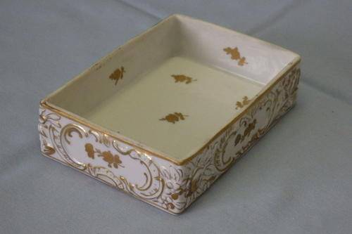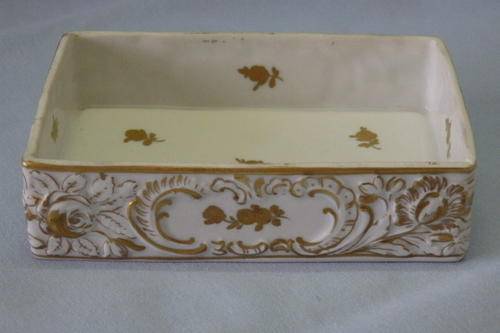 THIS STUNNING ORIGINAL VINTAGE (STAMPED) DRESDEN OF GERMANY HAND PAINTED WHITE PORCELAIN SWEETS/ CANDY PLATE/ BOX HAS STUNNING GOLD DETAILING AND MEASURES 12.3cm LONG x 8.5cm WIDE x 3cm HIGH. THE PLATE IS IN AWESOME CONDITION AND HAS NO CHIPS OR CRACKS IN IT, AND HAS MINIMAL AGE AND USAGE RELATED WEAR AND TEAR. THIS IS A FANTASTIC FIND FOR THE DRESDEN PORCELAIN COLLECTORS.