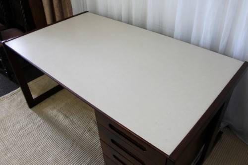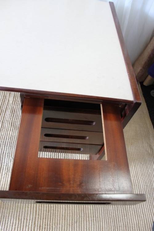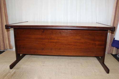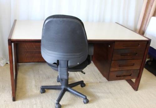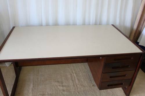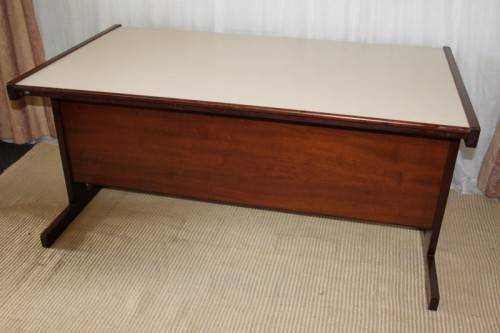 THIS STUNNING VINTAGE RETRO 3-DRAWER IMBUIA OFFICE DESK WITH AN IVORY MELAMINE WORKTOP IS IN EXCELLENT CONDITION AND HAS ABSOLUTE MINIMAL/ NORMAL AGE RELATED WEAR AND TEAR. THE DESK IS PERFECT AS AN EXECUTIVE'S DESK WITH VISITORS CHAIRS AND MEASURES 1600mm LONG x 900mm WIDE x 735mm HIGH. THERE IS A STATIONARY DRAWER, BUT THE HOLDER IS MISSING. PLEASE VIEW THE PICS CAREFULLY TO FULLY APPRECIATE THIS WONDERFUL VINTAGE RETRO DESK AND TO CONFIRM THE CONDITION. PLEASE NOTE THE CHAIR IS NOT INCLUDED.