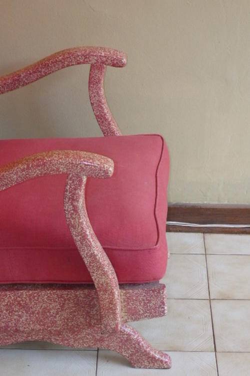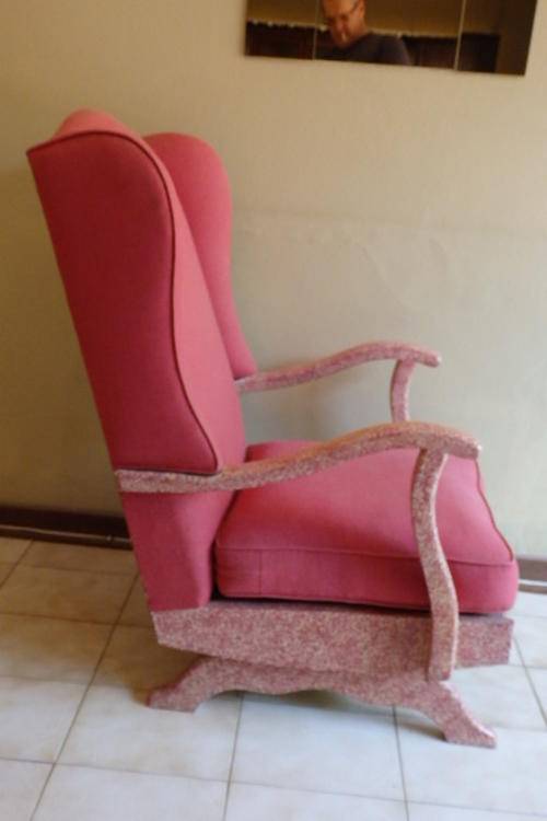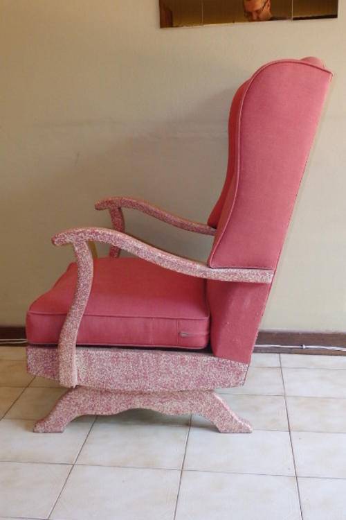 THIS STUNNING VINTAGE "SHABBY-CHIC" WING-BACK MECHANICAL ROCKING CHAIR IS IN STUNNING CONDITION AND ROCKS PERFECTLY. THE PINK "BULL LINEN" UPHOLSTERY HAS BEEN BEAUTIFULLY FINISHED IN A PINK AND CREAM PAINT TECHNIQUE. THE FABRIC IS IN GREAT CONDITION WITH MINIMAL SCUFFS. THE SEAT STILL HAS THE ORIGINAL COIFF STUFFING. THE CHAIR IS 1060mm TALL x 580mm LONG AND 750mm DEEP. THIS IS THE PERFECT ROCKING CHAIR FOR A MOTHER AND BABY AND WOULD LOOK AMAZING IN A CORNER.