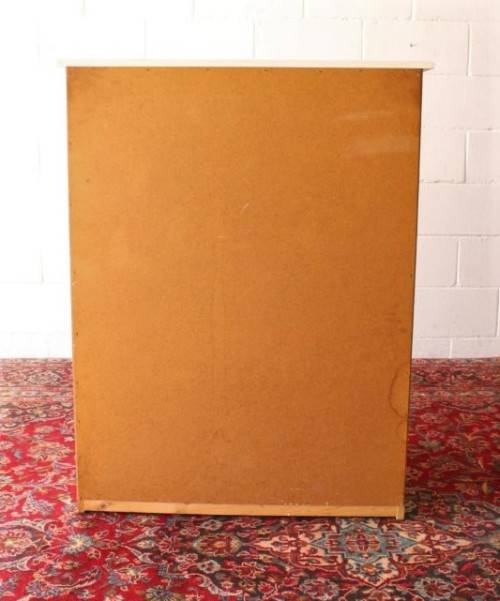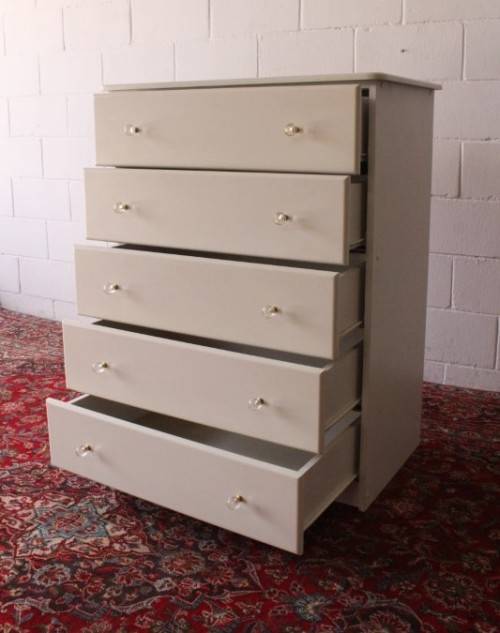This lovely 5-drawer white chest of drawers is perfect for any bedroom! The chest of drawers has five full-length, good sized drawers with loads of storage space for linen or clothes etc. The drawers each have two glass (possibly crystal) handles. The chest of drawers measures 82cm long x 48cm wide x 106cm high. There is minor age related wear and tear and scuffs on this beautiful chest but not particularly noticeable (see pics). Please view the pics carefully to fully appreciate this stunning chest of drawers and to confirm the condition.