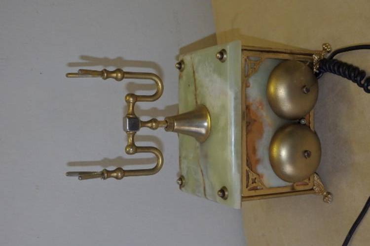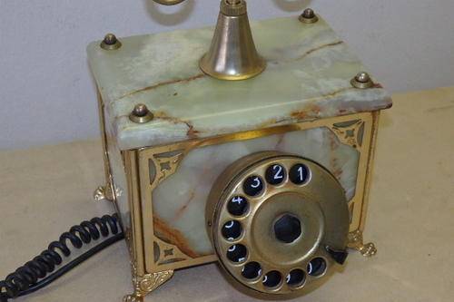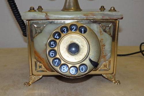 THIS STUNNINGLY BEAUTIFUL VINTAGE GREEN ITALIAN MARBLE ROTARY DIAL TELEPHONE WITH GOLD PLATE DETAILING AND LION PAW FEET MEASURES 26cm LONG x 21cm WIDE AND STANDS 26.5cm TALL. THE MARBLE IN IN EXCELLENT CONDITION WITH MINIMAL AGE AND USAGE RELATED WEAR AND TEAR. WE ARE NOT ABLE TO TEST THE TELEPHONE, BUT IT IS SOLD AS A SHOW PIECE. YOU WERE CONSIDERED "WELL TO DO" IF YOU HAD A TELEPHONE LIKE THIS IN YOUR HOME. THE TELEPHONES WERE MADE BY TELART ELECTRONICA IN ITALY.