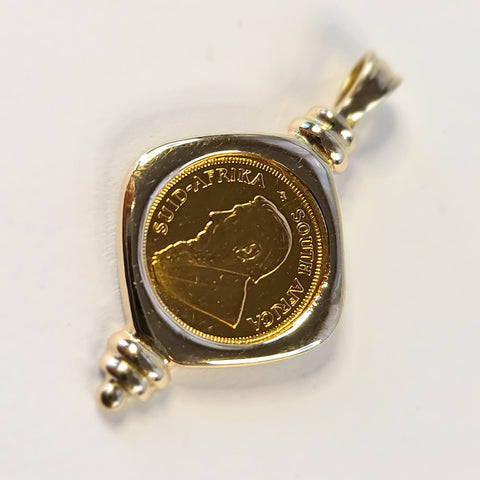 This 14ct gold pendant with a 22ct 1/10 Kruger Rand is quite classy and beautiful. The pendant in total weighs 7.50 grams. The Kruger rand 22ct weighs around 3.41 grams and the casing 14ct around 4.09 grams. This would be a lovely gift or spoil for oneself.