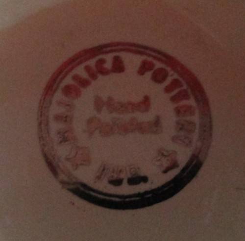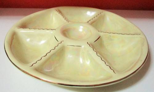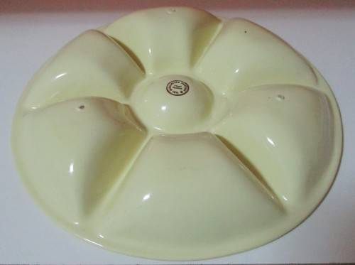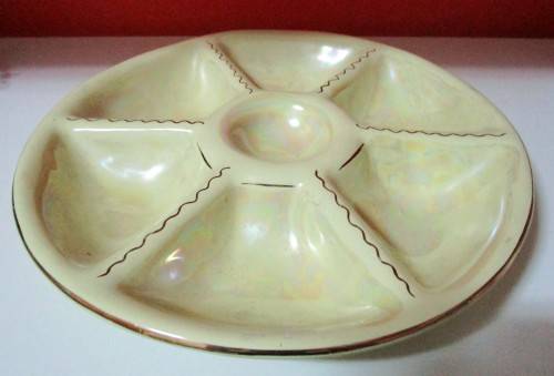 A Stylish glazed ceramic serving bowl was hand painted and made into a seven compartment ceramic snack serving dish. Each compartment of this ceramic server can hold a different dip, or use this retro snack tray to hold olives and other tidbits.