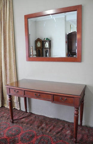 This stylish three-drawer console table with an amazing matching mirror is in lovely condition. The front of the table has three spacious drawers and there is a glass overlay on the top. The console table measures 150cm long x 55cm wide x 76cm high (the mirror measures 110cm long x 90cm high) and the set would be gorgeous in a living room, entrance hall or hallway. There is minor wear and tear on these items and they are both stunning. Please view the pictures carefully to fully appreciate this awesome and stylish console table and mirror set and to confirm the condition.