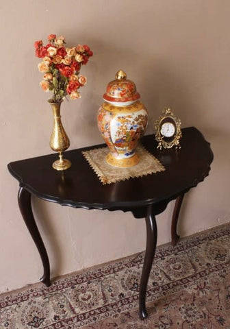 This gorgeous vintage imbuia half moon table with a scalloped edge is in good condition for its age and would look stunning in an entrance or hallway for that special piece you want on display. The size of the table is approximately 89cm long x 44cm wide x 75cm high. There is normal age and usage related wear and scuffs on the top of this table. Please view the pics carefully to fully appreciate this stunning half moon table and to confirm the condition