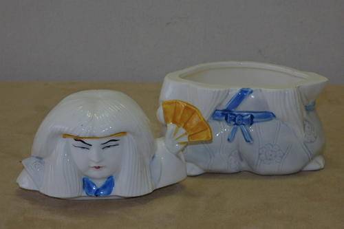 THIS SUPER RARE VINTAGE (1970's) JAPANESE MADE "SIGMA" KABUKI PORCELAIN CHARACTER SWEETS JAR DATES BACK TO THE 1970's AND WAS PART OF A COLLECTION OF SWEETS AND COOKIE JARS MADE BY THE COMPANY. THESE JARS ARE PRETTY SCARCE AND VERY COLLECTABLE, OFTEN ACHIEVING MANY R100's. THE JAR MEASURES 12cm TALL x 11.5cm LONG. THERE A FEW TINY CHIPS AROUND THE JAR AND TWO HAIRLINE CRACKS IN THE BACK OF THE JAR.