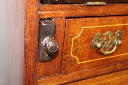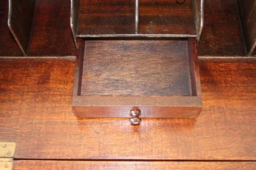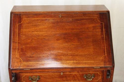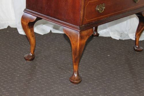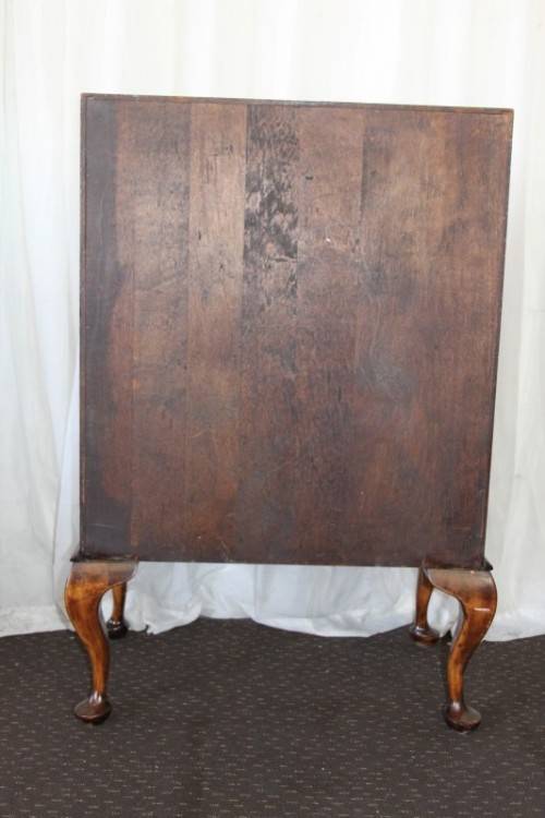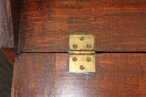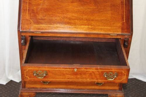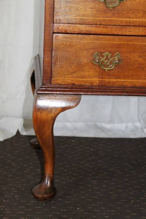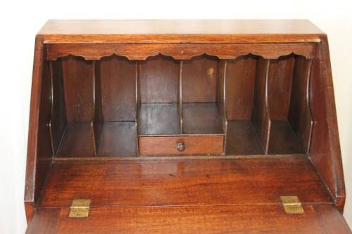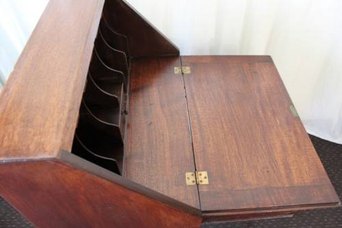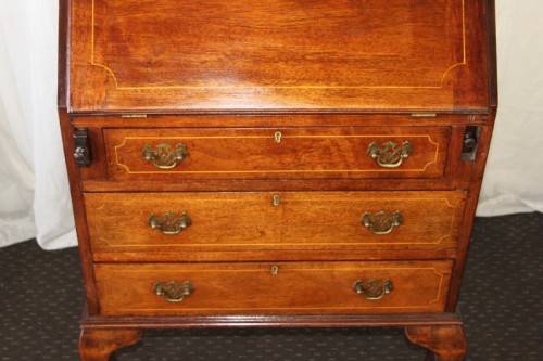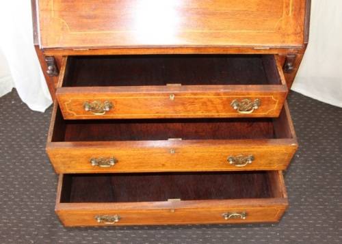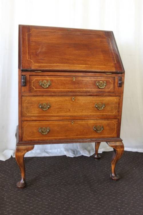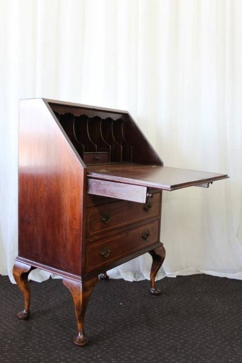THIS SUPERB ANTIQUE SOLID TEAK FLIP-TOP WRITING DESK WITH THREE DRAWERS AND INLAY DETAILING AROUND THE DESK HAS STUNNING PAD-FOOT CABRIOLE LEGS AND HAS AN ARRAY OF PIGEON HOLES WITH A SMALLS DRAWER. THE WRITING DESK IS IN STUNNING CONDITION FOR ITS AGE AND MEASURES 685mm LONG x 445mm WIDE x 1065mm HIGH. THE WRITING DESK HAS ABSOLUTE MINIMAL/ NORMAL AGE AND USAGE RELATED WEAR AND TEAR, AND IT IS STILL A BEAUTIFUL AND EXTREMELY WELL MADE DESK. THE DESK HAS TWO DRAWERS LARGER DRAWERS AND A SLIGHTLY SMALLER DRAWER JUST BELOW THE WRITING TOP. THE HANDLES ON THE DRAWERS AND GINGES ARE ALL SOLID BRASS. PLEASE VIEW THE PICS CAREFULLY TO FULLY APPRECIATE THIS EXQUISITE FLIP-TOP WRITING DESK AND TO CONFIRM THE CONDITION.