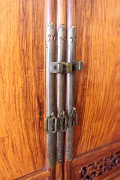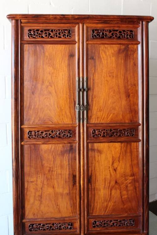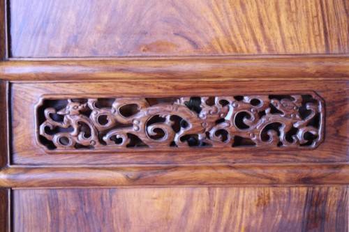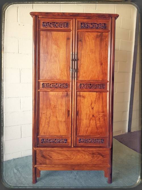 This superb and beautifully made solid Burmese teak double door cabinet/ cupboard with two internal drawers has incredible hand carved oriental themed dragon panels on the doors and sides of the cabinet with traditional brass door and drawer handles. The cabinet would be amazing as a linen cabinet but equally awesome as a drinks cabinet in a living room. The Burmese teak cabinet measures a stunning 91cm long x 48cm wide x 184cm high. This amazing cabinet sits well on the ground and is a solidly made piece. The frames of the drawers are a Burmese pine. The cabinet is in stunning condition with absolute minimal age and usage related wear and tear. Please view the pictures carefully to fully appreciate this beautiful solid Burmese teak cabinet and to confirm the condition.