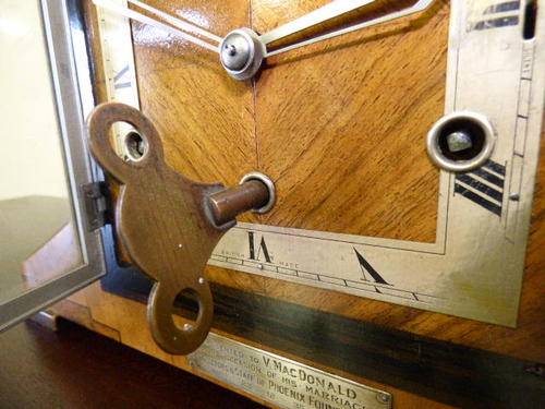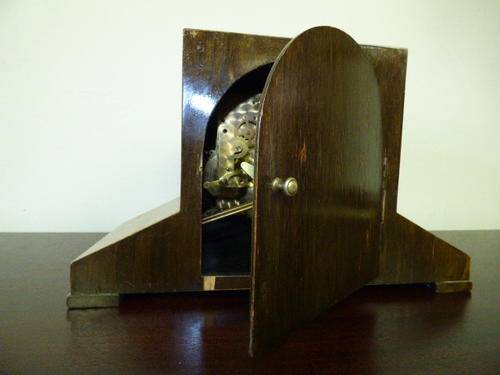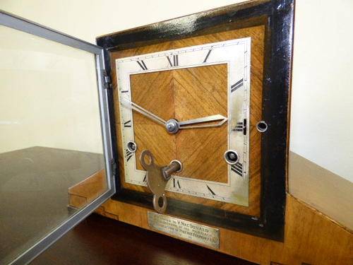 A STUNNING "BRITISH MADE" ART DECO (c1935) "WESTMINSTER CHIME" MANTLE CLOCK. THE CLOCK CHIMES ON THE QUARTERLY, HALF HOUR AND HOUR. IT HAS BEAUTIFUL CURVED GLASS IN THE DOOR AND WILL ADD STYLE TO ANY LIVING ROOM YOU CHOOSE TO DISPLAY IT IN. THE CLOCK IS IN GREAT CONDITION FOR ITS AGE AND DOES WORK INTERMITTENTLY. WE ADVISE THAT THE CLOCK BE SERVICED TO FULLY APPRECIATE THIS AMAZING ANTIQUE CLOCK. THE CLOCK MEASURES 14cm x 36cm x 22cm HIGH. THIS GORGEOUS CLOCK WAS A GIFT TO V MAC DONALD ON HIS WEDDING DAY IN 1935 AS STATED ON A PLAQUE ON THE FRONT OF THE CLOCK. THE CLOCK HAS THE WIND-UP KEY. THE CLOCK ALSO HAS AN ON/OFF SWITCH TO ENGAGE OR DISENGAGE THE CHIME. THERE IS MINOR AGE AND USAGE RELATED WEAR AND TEAR.