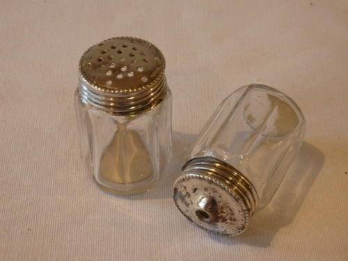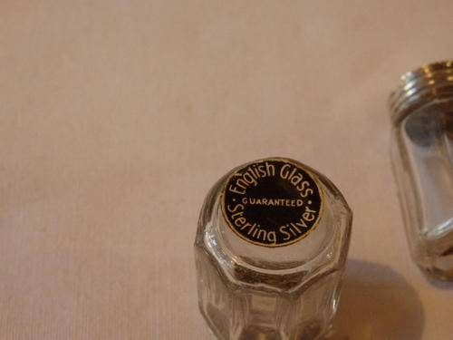 THIS EXQUISITE ENGLISH GLASS SALT AND PEPPER CELLAR SET WITH STERLING SILVER LIDS EACH MEASURE 3.5cm TALL AND ARE IDEAL FOR MEALS SERVED ON A TRAY OR EVEN AS PART OF INDIVIDUAL SETS AT A PLACE SITTING AT YOUR DINNER TABLE. THIS IS A VERY PRETTY SET.