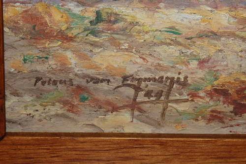 WHAT AN ABSOLUTE GEM OF A FIND!!! THIS SPECTACULAR ORIGINAL SIGNED AND DATED OIL ON BOARD LANDSCAPE PAINTING BY FAMOUS SA ARTIST PETRUS VAN EMMENIS (1915 TO 1998) HAS BEEN EXQUISITELY FRAMED IN A BROAD SOLID WOODEN FRAME AND MEASURES 40cm x 35cm (FRAME TO FRAME). THE PAINTING WAS PAINTED IN 1944 WHEN VAN EMMENIS WAS LIVING IN THE CAPE. THE COLOURS AND DETAILING IN THIS PAINTING ARE STUNNING AND ONE CAN SEE WHY HE WAS A MASTER PAINTER!!!!