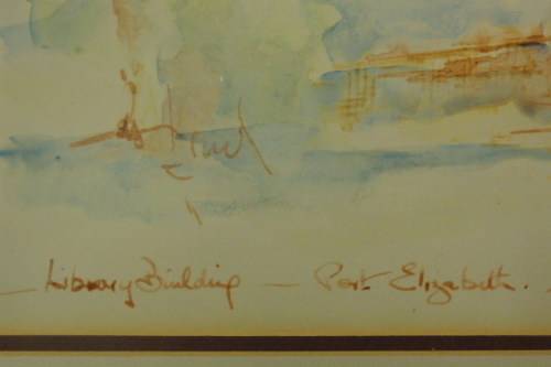 THIS SUPERB ORIGINAL WATERCOLOUR PAINTING OF "THE LIBRARY BUILDING - PORT ELISABETH" BY INTERNATIONAL ARTIST EDMUND BARTON (LIVING IN SOUTH AFRICA) IS PART OF HIS HISTORICAL SOUTH AFRICAN BUILDING COLLECTION WHICH I BELIEVE WAS A SPECIFICALLY COMMISSION. THE PAINTING IS FRAMED BEHIND NON-REFLECTIVE GLASS IN A SOLID WOODEN FRAME. THE PAINTING IS IN BEAUTIFUL CONDITION AND MEASURES 570mm WIDE x 675mm HIGH. HIS APPLICATION OF COLOURS AND ATTENTION TO DETAILING MAKES THIS ENTIRE COLLECTION A MASTER PIECE. THE PAINTING IS SIGNED AND THE TITLE INSCRIBED ON THE PAINTING. YOU ARE WELCOME TO VIEW THE COLLECTION AT OUR EDENVALE BRANCH.