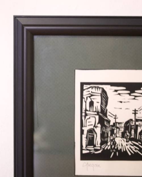 This stunning and rare original signed and framed Gregoire Boonzaier (1909 to 2005) linocut print of "District Six" is an amazing find measures 40cm wide x 34.5cm high in the frame and 20cm x 17cm ex frame. The frame ideally would need replacing.