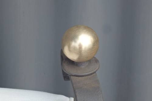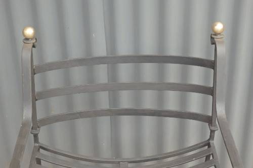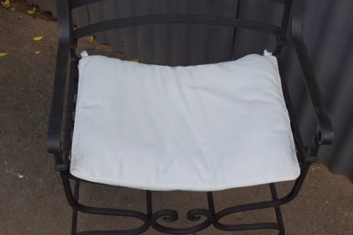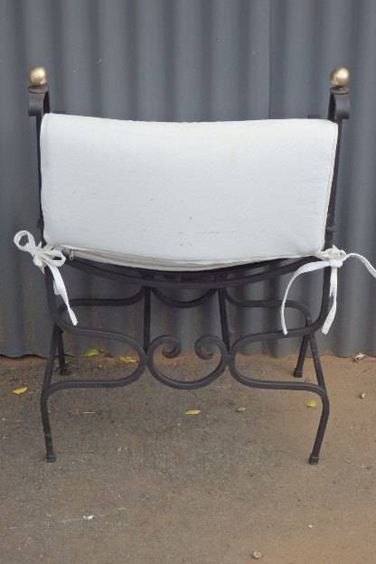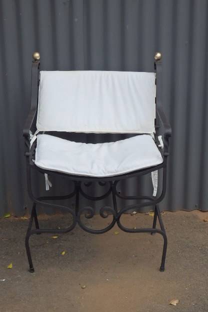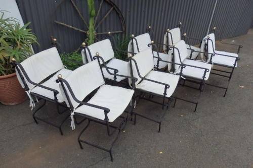 THIS SUPERB SET OF 8x BLACK WROUGHT-IRON "CARVER" DINING CHAIRS WITH SOLID BRASS FINIALS AND WHITE BULL DENIM CUSHIONS ARE IN EXCELLENT CONDITION WITH MINIMAL AGE AND USAGE RELATED WEAR AND TEAR. THESE CHAIRS ARE SOLID AND HEAVY AND EXTREMELY WELL MADE. THEY WOULD LOOK JUST AS AMAZING ON A PERSIAN CARPET IN A FINE DINING ENVIRONMENT AS WHAT THEY WOULD LOOK IN A MORE CASUAL "PATIO" DINING ENVIRONMENT. THE CUSHION TIE-DOWNS ARE ALL INTACT AND THE CUSHIONS ALL HAVE ZIPS SO THAT THE FABRIC CAN BE WASHED. PLEASE NOTE THAT THE CUSHIONS DO NEED A CLEANING. .
