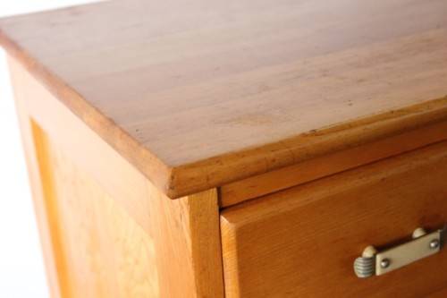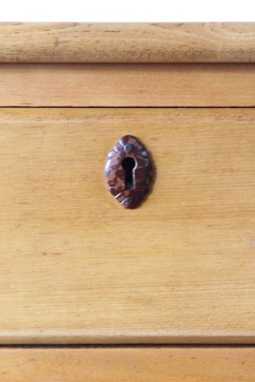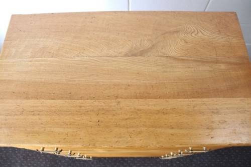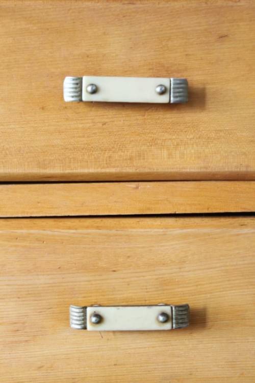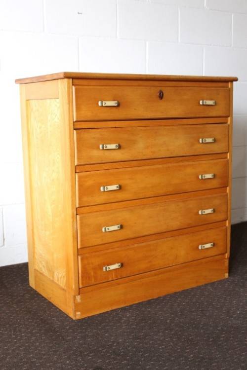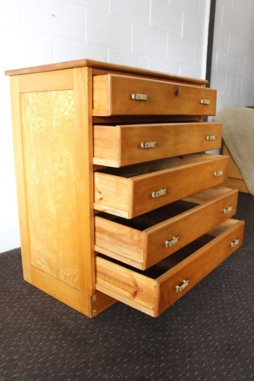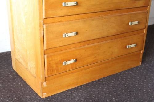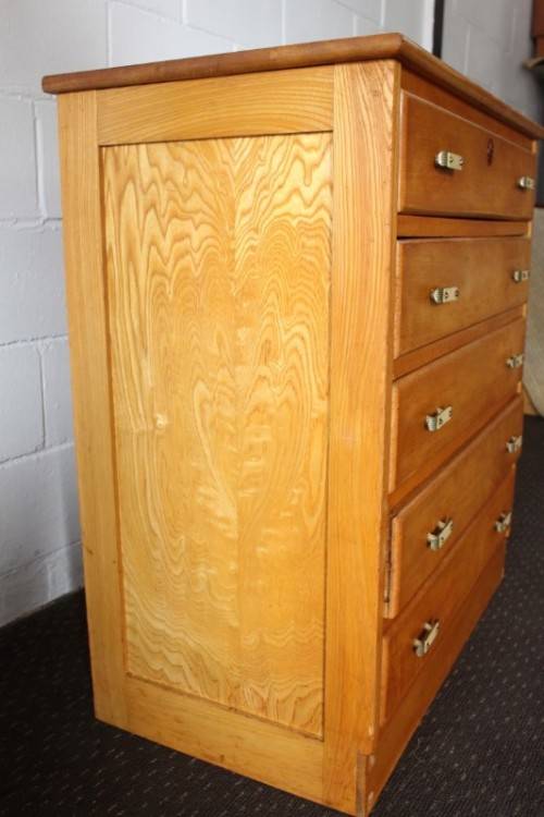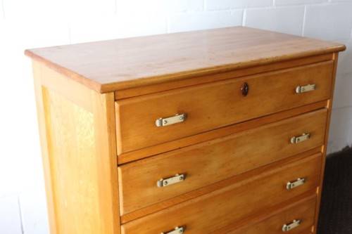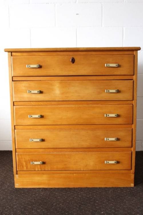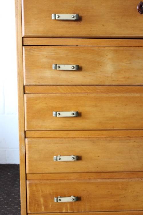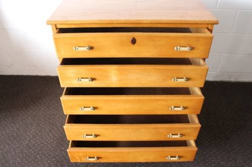 This superb vintage Yellow wood 5-drawer chest of drawers with beautiful period style Art Deco handles is in gorgeous vintage condition and measures 82cm long x 47cm wide x 89cm high. The top drawer of the chest of drawers has a lock, but we do not have the key, however, the lock could easily be replaced. The chest of drawers has normal vintage related wear and tear and scuffs etc which adds to the charm of this lovely piece. The silver metal Art Deco handles are also in good condition, and the bakelite? strips are all still intact. Please view the pics carefully to fully appreciate this stunning yellow wood chest of drawers and to confirm the condition. Please view the shipping options or request courier costs prior to purchasing any of our products.