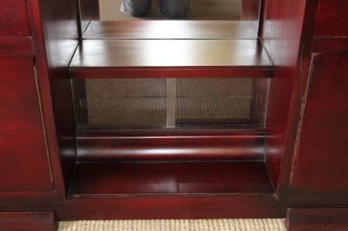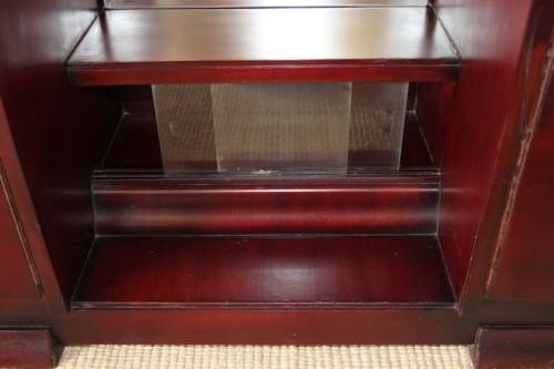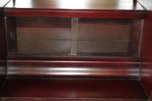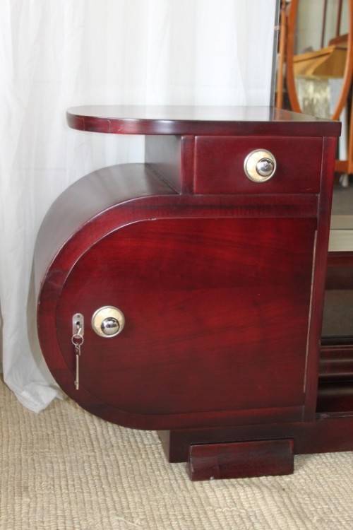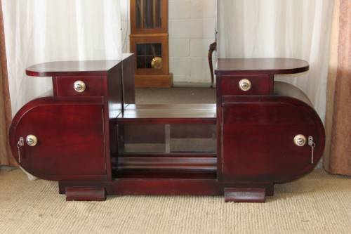 THIS FABULOUS VINTAGE (c1930 TO 1950) ART DECO BENT-WOOD DOUBLE CABINET DRESSING TABLE WITH TWO DRAWERS AND A STORAGE SHELF WITH SLIDING GLASS DOORS IS A STUNNING FIND!!! THE DRESSING TABLE IS SO TYPICAL OF THE PERIOD FURNITURE OF THE ART DECO PERIOD AND WOULD SUITE ANY PERIOD STYLED BEDROOM. THE DRAWERS AND THE CABINET DOORS HAVE STUNNING ROUND CHROME AND MOTHER OF PEARL STYLE HANDLES. THIS GORGEOUS DRESSING TABLE MEASURES 1560mm LONG x 450mm WIDE x 1450mm HIGH. THE DRESSING TABLE HAS NEW LOCKS ON BOTH THE DOORS WITH THE KEYS. THERE IS A WONDERFUL PERFUME SHELF BETWEEN THE TWO CUPBOARDS TOO. THE DRESSING TABLE MINOR/ NORMAL USAGE RELATED WEAR AND TEAR AND SCUFFS. PLEASE VIEW THE PICS CAREFULLY TO FULLY APPRECIATE THIS STUNNING ART DECO DRESSING TABLE AND TO CONFIRM THE CONDITION.