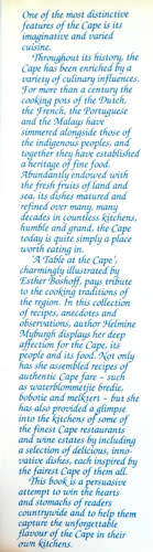 Synopsis: 'A Table at the Cape' charmingly illustrated by Esther Boshoff, pays tribute to the cooking traditions of the region (Dutch, French, Portuguese, Malay and Indigenous).It is a collection of recipes, anecdotes and observations.
