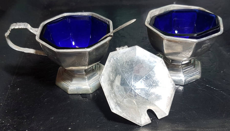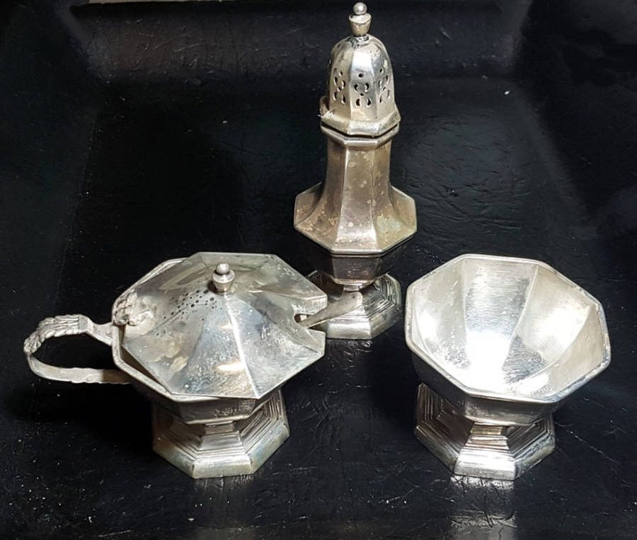 A Three Piece Sterling Silver Condiment Set. Height of shaker 10.5 cm Total weight less the glass liners 146 gm.