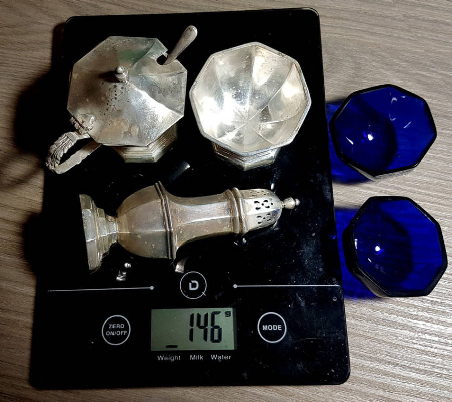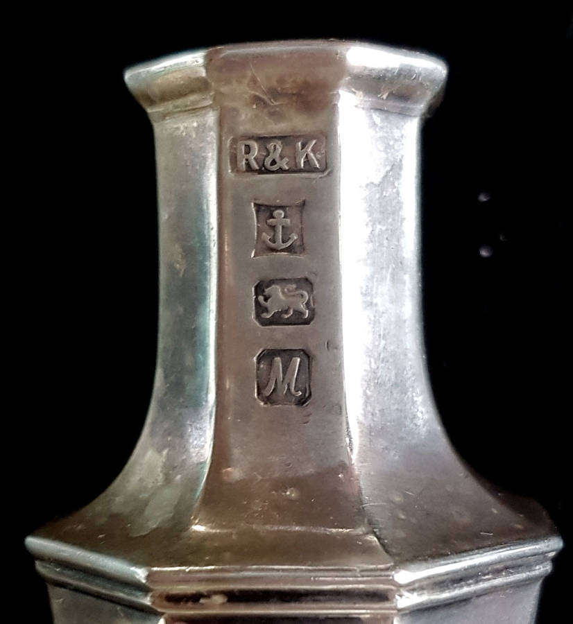 Birmingham Hallmarks for 1986 (M). Maker's mark: "R&K" for Richards & Knight. All pieces so hallmarked except the little spoon which is mismatched and hallmarked for 1935-36.