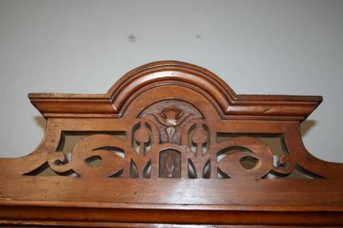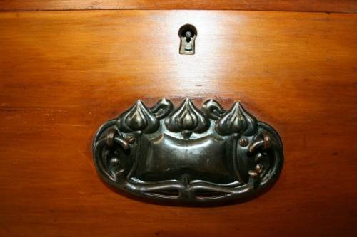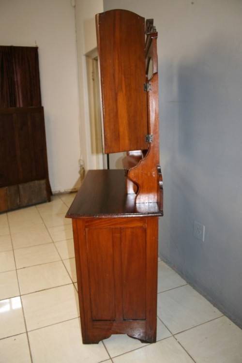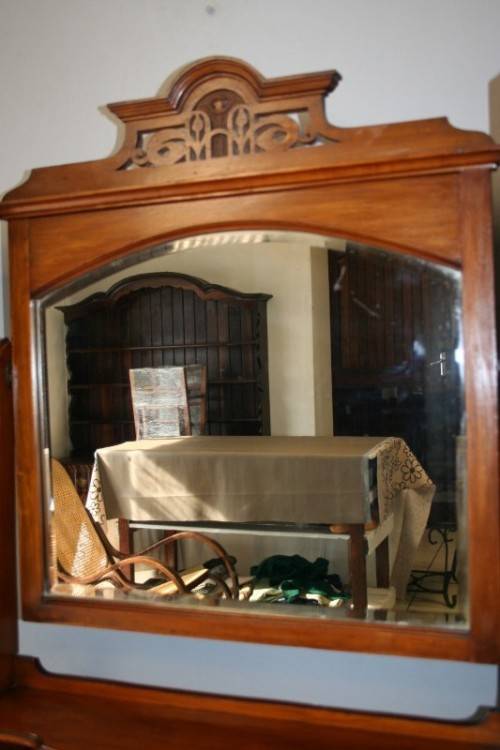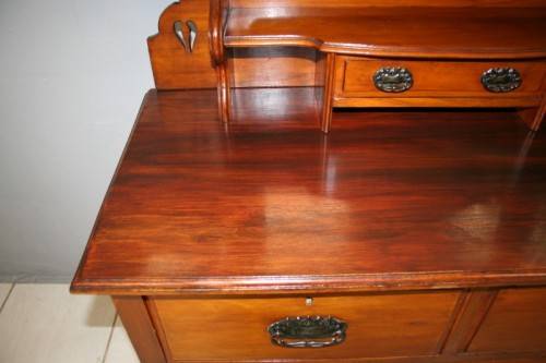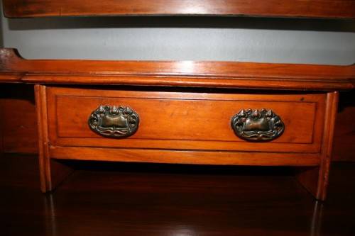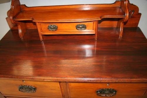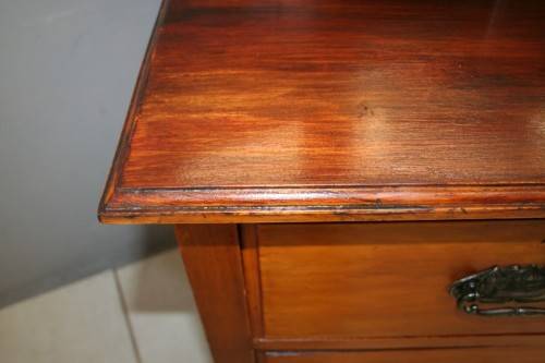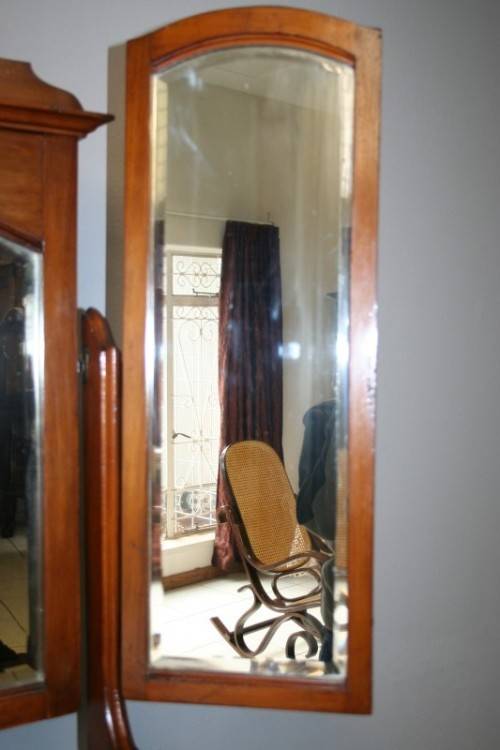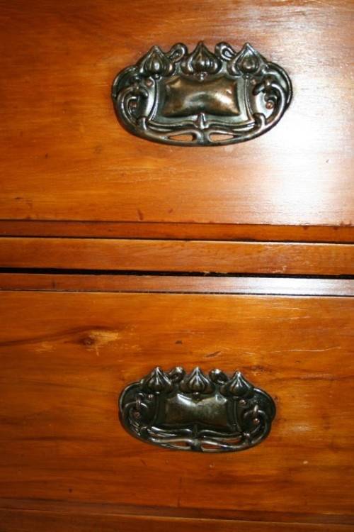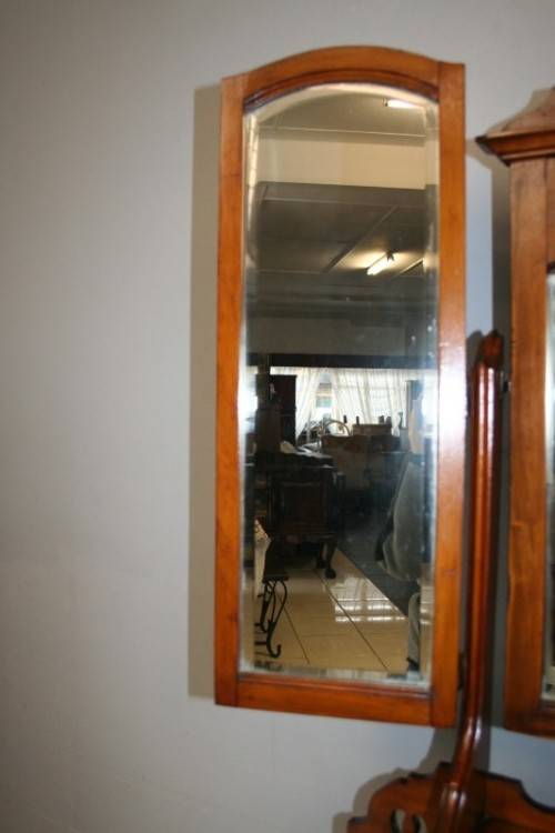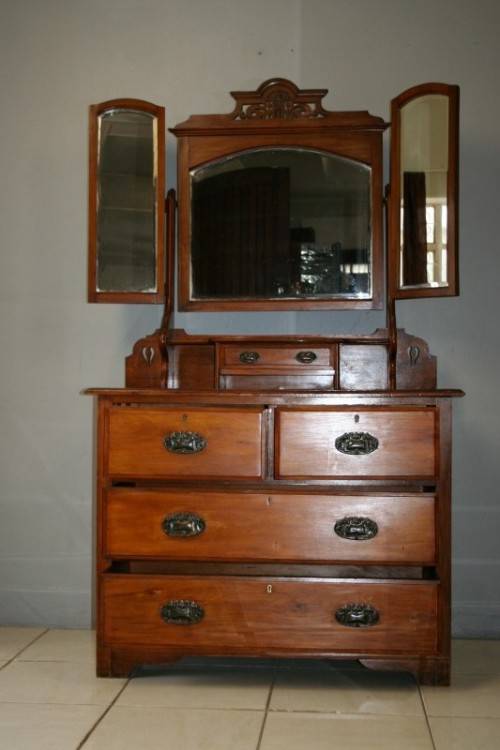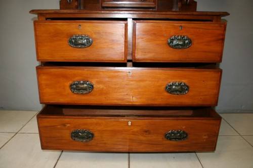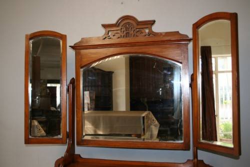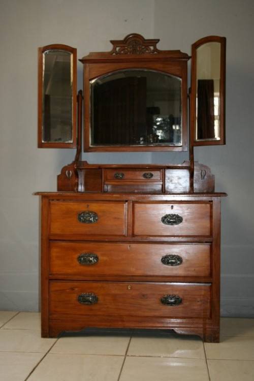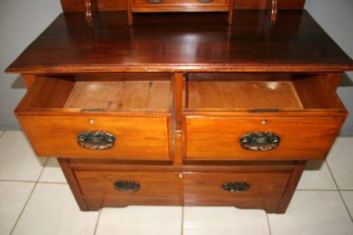 THIS TRULY BEAUTIFUL ANTIQUE SOLID OREGON PINE 5-DRAWER CHEST OF DRAWERS WITH A TRI-FOLDING VANITY MIRROR IS A STUNNING FIND. THE CHEST HAS TWO LARGE DRAWERS WITH TWO SMALLER DRAWERS AND A SINGLE "TRINKETS" DRAWER ON TOP. THE VANITY DRAWERS WERE OFTEN USED BY GENTLEMEN AS SHAVING VANITIES WITH THEIR CLOTHES PACKED BELOW OR IN A LADIES PARLOUR AS A VANITY / MAKE-UP MIRROR. THE DRAWERS ARE IN STUNNING CONDITION FOR THEIR AGE AND HAVE EXQUISITE ART NOUVEAU HANDLES. BESIDES BEING IDEAL FOR A DRESSING ROOM OR PARLOUR, THE DRAWERS WOULD MAKE A SPECTACULAR WASH STAND IN A BATHROOM. THE VANITY DRAWERS MEASURE 1070mm LONG x 485mm DEEP x 1845mm HIGH. THERE IS MINIMAL/ NORMAL AGE AND USAGE RELATED WEAR AND TEAR. PLEASE VIEW THE PICS CAREFULLY TO FULLY APPRECIATE THIS STUNNING DRAWER AND VANITY MIRROR COMBO AND TO CONFIRM THE CONDITION.