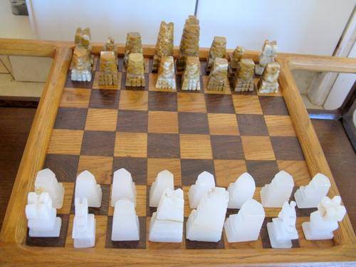 NB. The chess pieces are heavy and to courier this could be expensive. The table measures 86cm by 45cm and a height of 40cm.One of the chess pieces was broken and has been stuck together.Otherwise in good condition.I am not sure what the chess pieces are made of. The darker set looks like agate but they could be marble.See photo's.