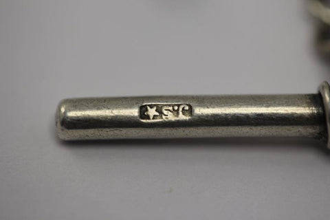 This hallmarked sterling silver fob chain has the makers mark (*S.C), the Lion passant confirming it is British sterling silver and the date letter "b". Without the town Assay it is difficult to date the chain, Birmingham "b" dates to 1901 where as London 1897 etc. The necklace is made up of components by different makers. Any help with the makers mark would be appreciated. The Fob and chain weigh 23.46 grams. This is great if you are a pocket watch fan to wear your pocket watch.