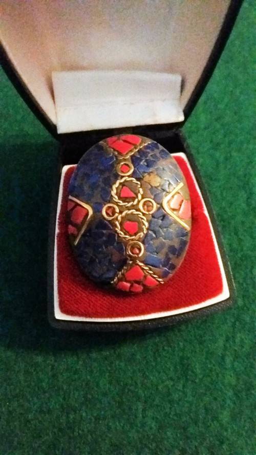 WOW!! This is for the lady who likes her big bold and beautiful statement piece of jewellery. The ring is adjustable and it is made in brass with coral and lapis lazuli. It measure approx. 4cm x 3cm. It looks great on the finger. The box is for display only. Please note payment to be made no later than Monday after close of auction. Thanks for looking