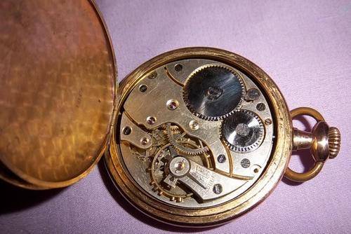 A VERY NICE GOLD PLATED MECHANICAL POCKET WATCH.  GOOD CONDITION AND WORKING. DIAL HAS A HAIRLINE CRACK.  A VERY NICE PIECE.