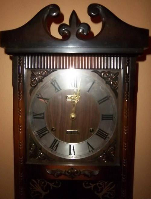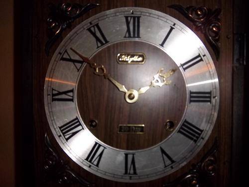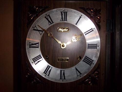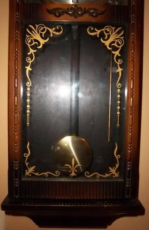 A VERY NICE RHYTHM 30 DAY WALL CLOCK. WORKING. STRIKES THE HOUR AND HALF-HOUR. GOOD OVER ALL CONDITION. THERE IS A SILENT OPTION AS WELL. PENDULIM. X2 BARREL MECHANICAL MOVEMENT. NO KEY.