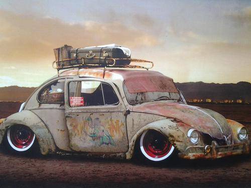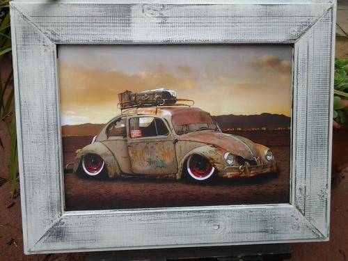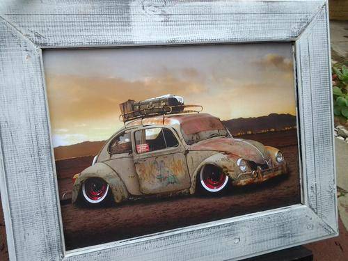 A unique one-of-a-kind "Shabby-Chic" framed VW Beetle. The Beetle has a very vintage look but the rims have a jazzed up modern look that makes the picture a definate head-turning art piece that will brighten up any room.