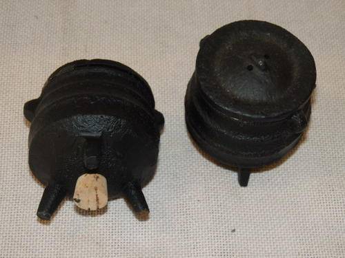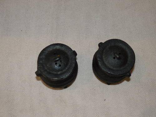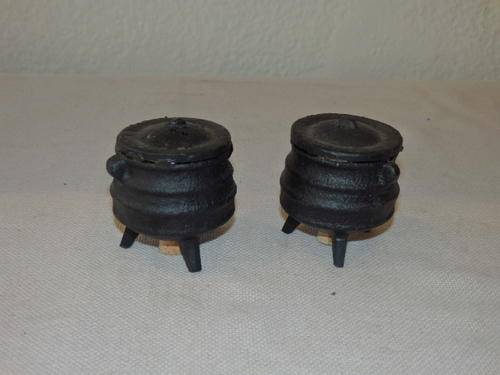 THIS VERY UNUSUAL BLACK CAST IRON "THREE LEGGED POT" SALT AND PEPPER CELLAR SET IS THE IDEAL SET FOR AROUND THE BRAAI OR OUTDOORS. THE BOTTOMS HAVE CORKS. THE POTS MEASURE 5.5cm TALL X 5.5cm WIDE. THEY ARE QUITE DIFFERENT!!