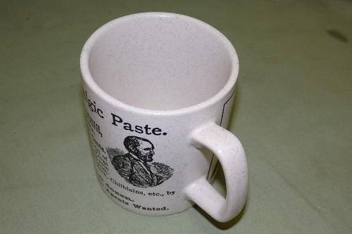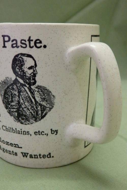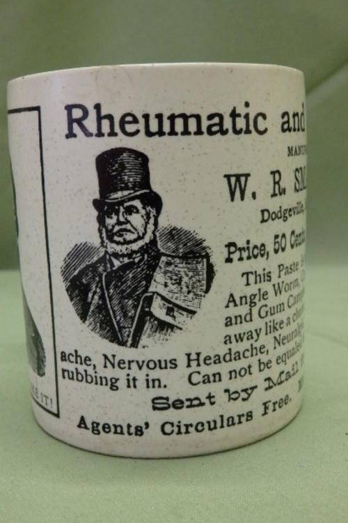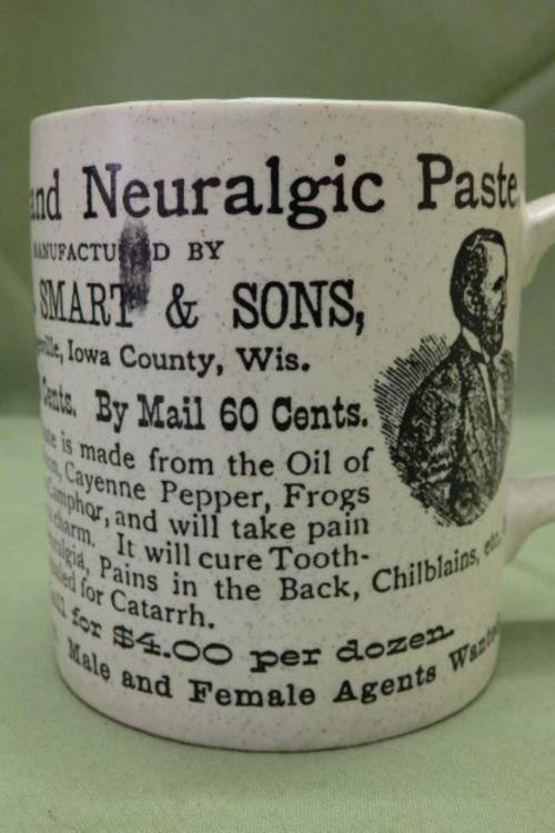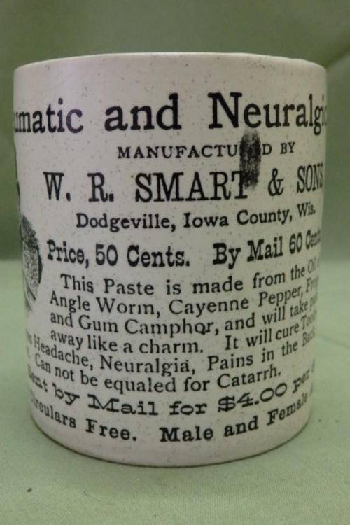 THIS VERY UNUSUAL CERAMIC (NOVELTY) WR SMART & SONS OF DODGEVILLE, IOWA COUNTY, WISCONSIN "RHEUMATIC AND NEURALGIC PASTE" BRANDED MUG WOULD MAKE AN AWESOME GIFT FOR A DOCTOR OR JUST AS A NOVELTY PIECE IN A PUB OR BAR. THERE ARE NO CHIPS OR CRACKS IN THE CUP.