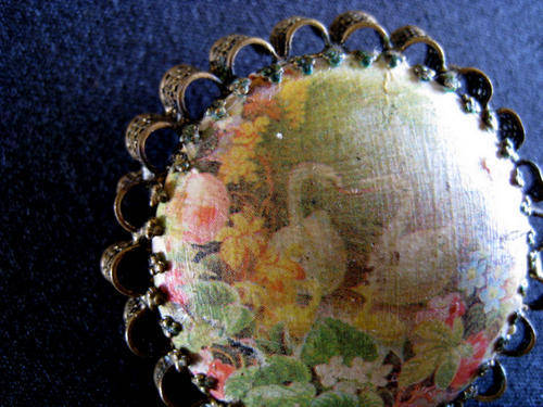 A Lovely Vintage Decoupage Victorian brooch - with a scene of two swans on a pond surrounded with foliage