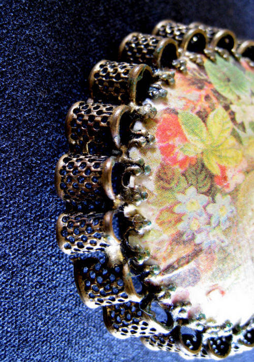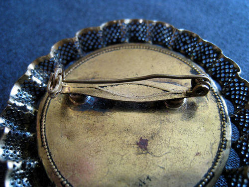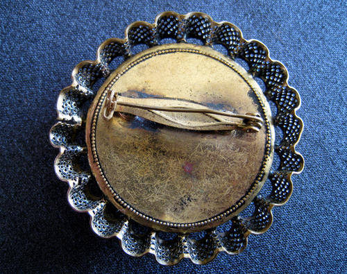 The decoupage panel is set in a beautiful, ornate, brass, filligree casing. The delicate casing shows a few minor bumps, but hardly noticeable The back is also brass and fitted with a pin and round clasp fastening