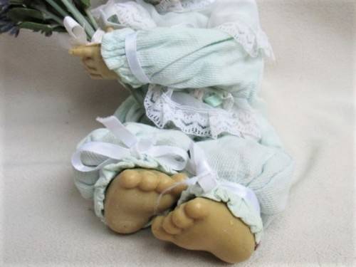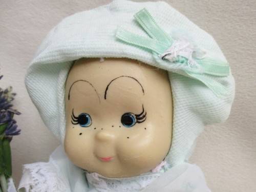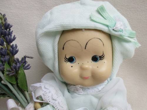 I CANNOT QUITE MAKE OUT WHAT THIS DOLL IS MADE OF - IT SEEMS TO BE A TYPE OF PLASTIC/VINYL WITH A SORT OF WAXY FINNISH. SHE HAS A CLOTH BODY FILLED WITH SAND AND FIXED CLOTHING - HER HEAD, HANDS AND FEET ARE MADE OF THIS STRANGE TYPE OF PLASTIC/VINYL. SHE IS 29CM TALL, IN VERY GOOD CONDITION AND UTTERLY ADORABLE! REFER IMAGES