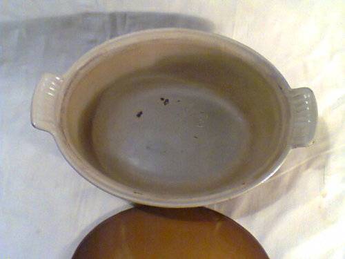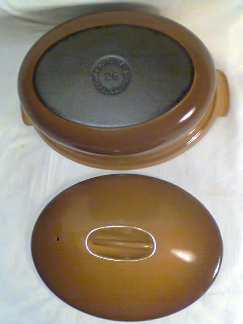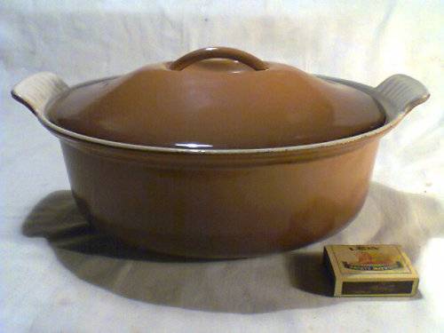 Vintage 1950's " Le Creuset Made in France No 26 " Oven roasting pot which makes a mouth watering roast. Well used a little stained inside & sold as second hand condition.