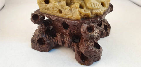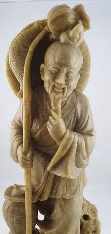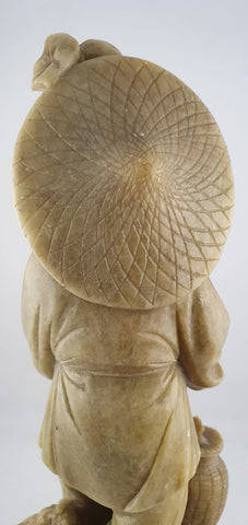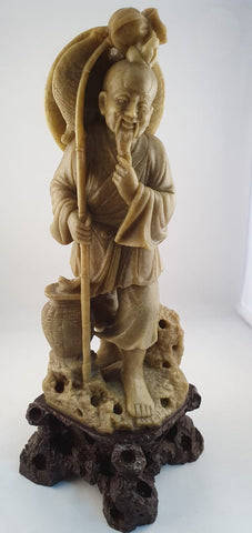 A vintage carved Soap stone figure of an Oriental fisherman on a stand