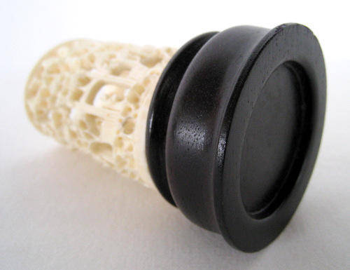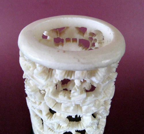 A beautiful hand carved elephant ivory oval ornament depicting a typical Chinese scene of horseman, pagodas, people, tree and boats. The vase is typically carved from a section of an elephant tooth. The carved piece is attached to the black wooden base. The vase and stand are both in immaculate condition. This item was inspected using a jewellers loupe and the Schreger diamond patterns identifies this item as genuine ivory. The diamond pattern can be clearly seen through the jewelers loupe. Please refer to the last picture