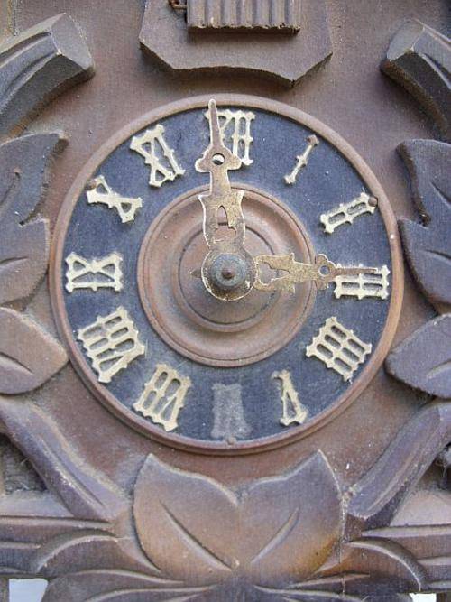A German Cuckoo clock made of wood gathered from the Bavarian forest . There is an extra mounting that decorates the "houses" roof but it broke in two , I will add this to your package , it is a deers head mounted on a shield with leaves flowing off the sides of the head .