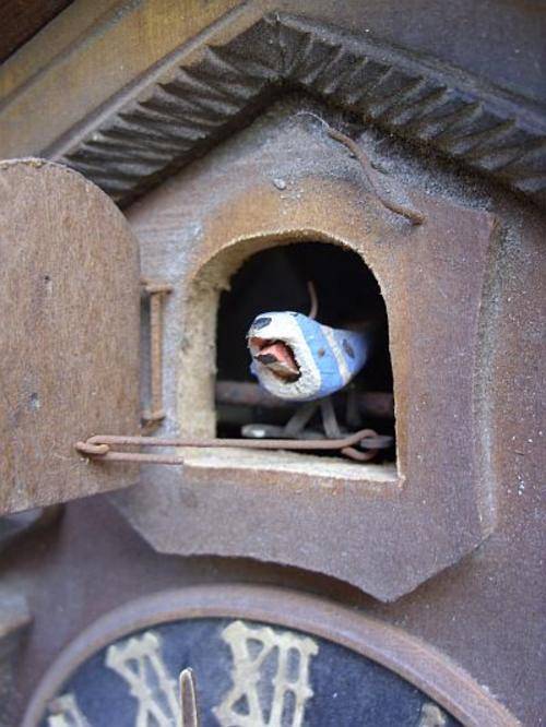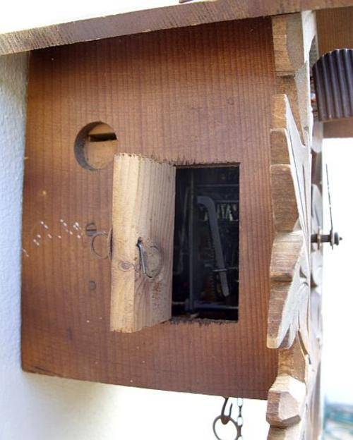 As you can see there has been a repair to the front leaf decor and the weights are missing . The Cuckoo clock does however still contain its mechanism and the shell is also useful and decorative therefor , combined with the fact that Cuckoo clocks are highly collectable , a worthy listing .