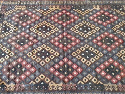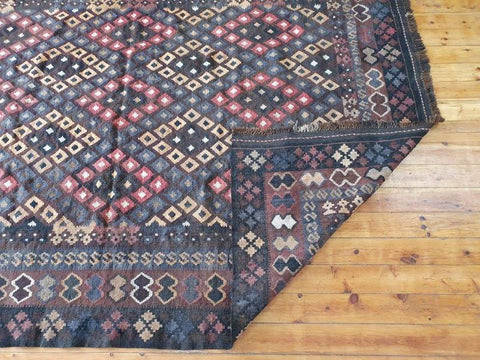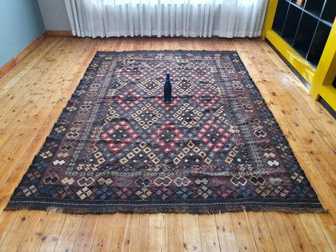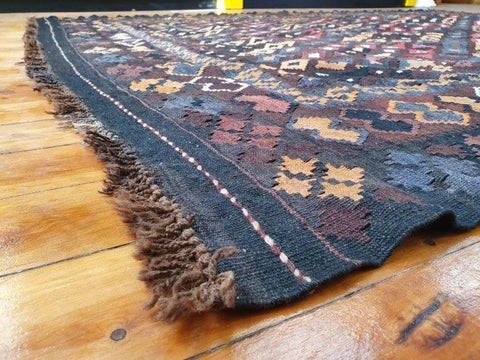 This beautiful Kilim carpet measures 200cm long x 270cm wide. The carpet is in good condition and has minor age and usage related wear and tear as shown in the pics. The carpet combines blacks and brown colours. The Kilim carpet would look amazing in a formal living room, tv lounge or bedroom. Please view the pics carefully to fully appreciate this amazing Kilim carpet and to confirm the condition.