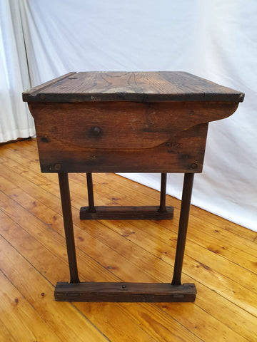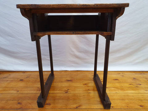 This wonderful old school wooden desk is in good usable condition! It measures 53cm wide x 66cm long x 74cm high. There is age related wear and tear on this item and it is sold as is. It could be painted or sanded down with a new coat of varnish. The metal frame is good and sturdy on the ground. Please view the pics carefully to fully appreciate this desk and to confirm the condition